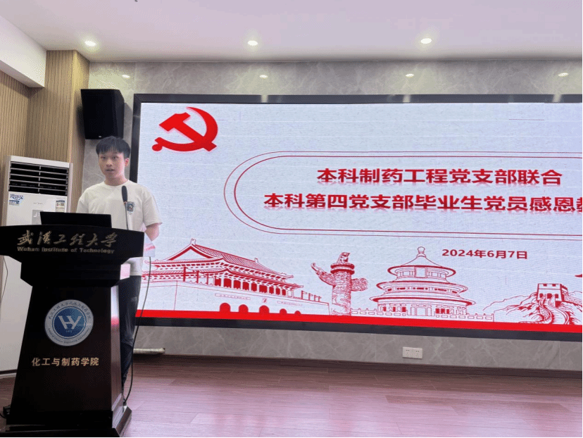 本科制药工程党支部书记梅军表达了对毕业生的祝福和期许,希望大家一要常怀感恩之心,感恩党和国家,感恩师长亲友;二要牢记党员身份,继续保持拼搏、奋斗的精神,充分发挥党员先锋模范作用。