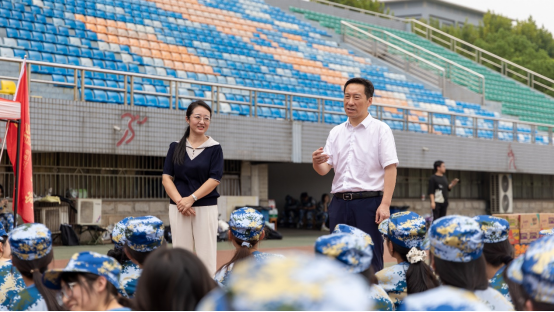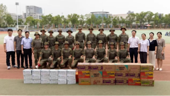本网讯(通讯员 翟森稳 张锦)9月14日上午,化工与制药学院党委书记杨海波、副书记周丹一行前往流芳校区田径场,慰问一线军训教官和学院正在参训的2024级新生,并送上慰问物资以及中秋祝福。