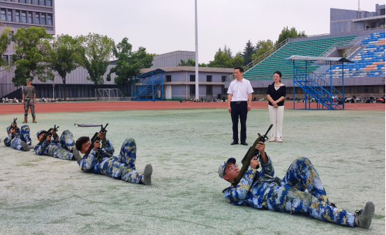 杨海波、周丹来到一营一连慰问学院新生,立即被同学们整齐划一的队列、铿锵有力的口号声所吸引,沿着训练场逐一观看了分列式、战术演练等多个训练科目。同学们坚毅眼神、英姿飒爽,无不彰显着新一代化药学子的风采与担当。