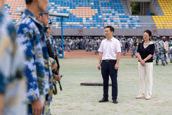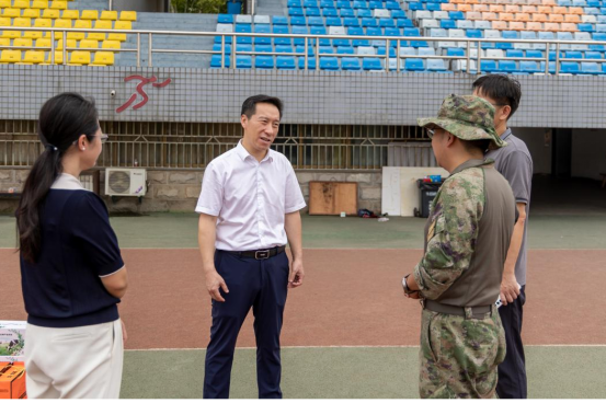 在慰问过程中,杨海波与同学们亲切交谈,详细询问了同学们的训练感受及遇到的困难,鼓励大家要勇于挑战自我、战胜困难。他指出,军训不仅是一场体能的锻炼,更是一次心灵的洗礼。同学们在烈日下坚持训练,皮肤虽被晒黑,但体魄更加健硕,意志更加坚定,集体意识也愈发牢固。这种不畏艰难、刻苦耐劳的坚强毅力,是每一位学子未来成长道路上不可或缺的宝贵财富。他表示,经过连日训练,同学们军姿挺拔、斗志昂扬,充分展现了新时代青年大学生的良好精神风貌。希望同学们珍惜此次难得的机会,刻苦训练,将军训中养成的良好习惯和坚强意志带入到今后的学习和生活中去,以更加昂扬的姿态迈向新征程。