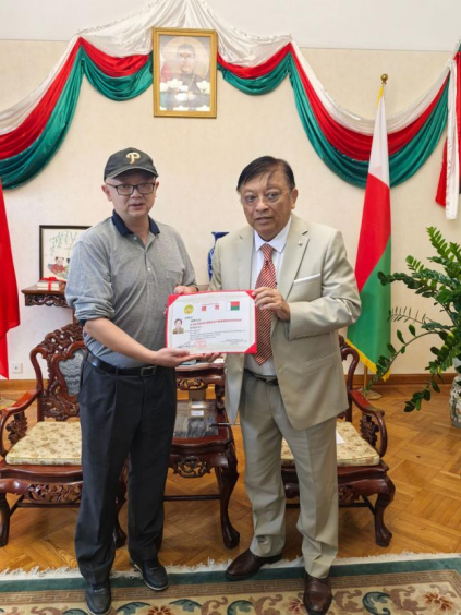 (通讯员 张林峰)近日,化药学院周霁老师在北京受聘为马达加斯加共和国驻华大使馆特聘安全教育顾问。马达加斯加共和国驻华大使让•路易•罗宾逊先生接见了周霁,并为其颁发了聘书。
