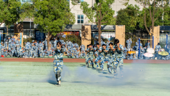 战术方阵汇演中,57名化药本科新生如铁流涌动,身手矫捷,配合默契,战术动作精准有力,队形变换迅疾而有序,展现出战士般的坚韧与智慧,令人叹为观止,尽显国防教育成果。