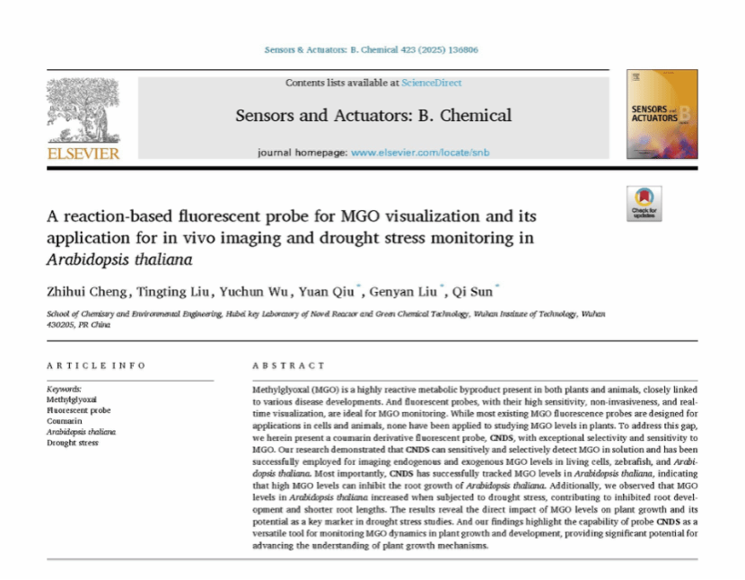 本网讯(通讯员 徐志强)近日,化工与制药学院化学工程与工艺专业2021级本科生程智慧以第一作者在国际知名期刊Sensors and Actuators: B. Chemical(中科院一区TOP期刊,影响因子8.0)发表了题为《A reaction-based fluorescent probe for MGO visualization and its application for in vivo imaging and drought stress monitoring in Arabidopsis thaliana》的学术论文。武汉工程大学为唯一署名单位,化工与制药学院药物先导与功能分子团队刘根炎教授与孙琦副教授为论文共同通讯作者。