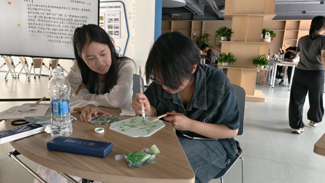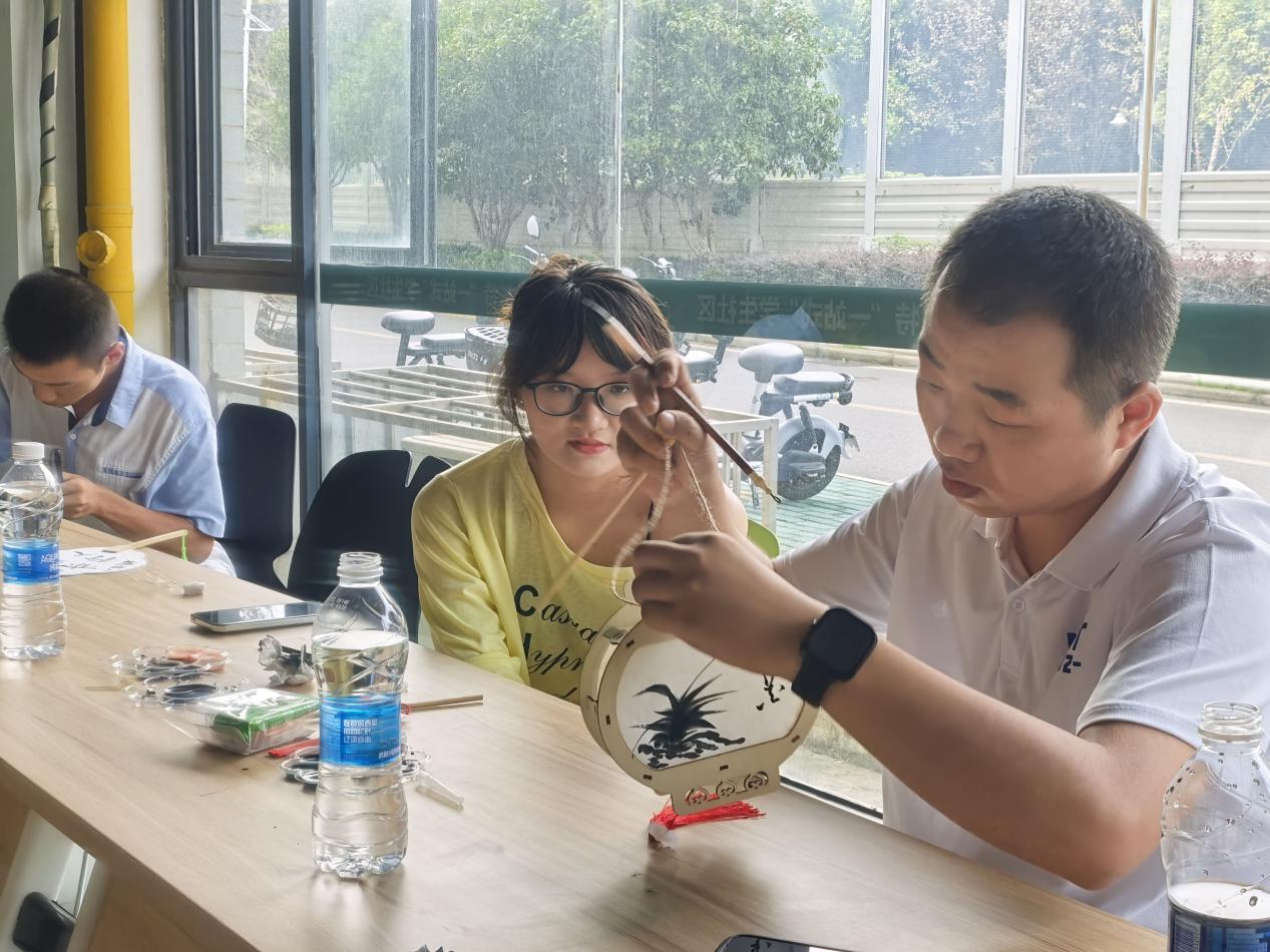 在绘灯画扇活动中。张列罡简单介绍了灯笼与扇面的制作要点与配色思路,并提供了中秋主题的参考素材。随后,大家自由组合,三两成组,在柔和的灯光下,静静地勾勒、晕染。扇面上,梅兰竹菊的雅致与明月玉兔的灵动交相辉映;灯身间,经典宫灯的端庄与可爱兔灯的俏皮相映成趣。独一无二的专属灯笼与团扇,就这样在大家的巧思与指尖中诞生。