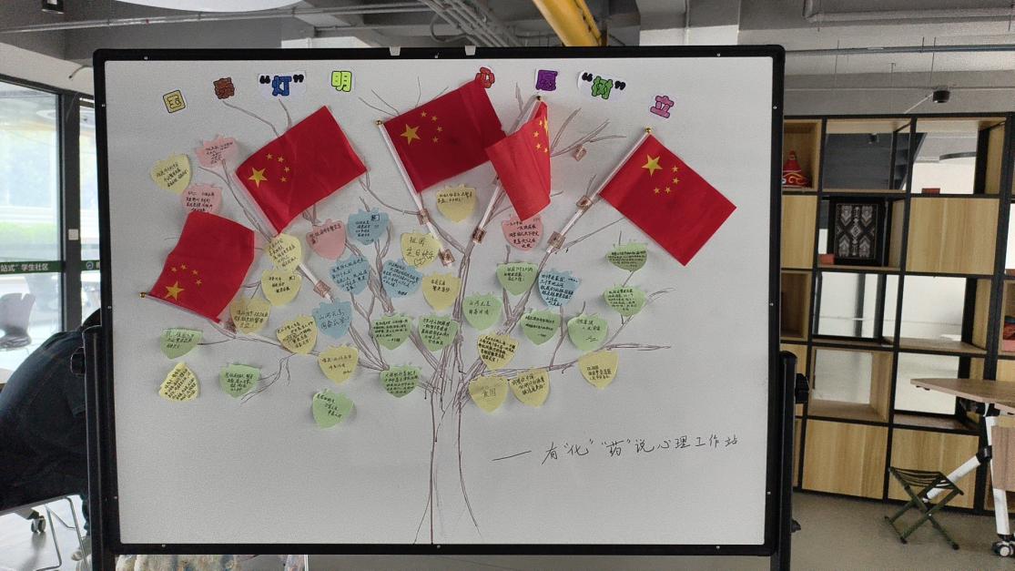 活动中,学院“化”“药”说心理工作站指导老师刘悦薇,带领站长俞皓天、副站长刘雨,与同学们一起开展了以“国泰‘灯’明,心愿‘树’立”的主题活动,师生们在国庆、中秋知识问答中穿梭于岁月长河,于《我和我的祖国》的合唱声里抒发赤子深情。一张张写满对祖国繁荣昌盛的期许、对亲友顺遂安康的祈愿的心愿卡,化作了一树璀璨的“心愿花”,让家国情怀与人文温度在此间交织绽放。