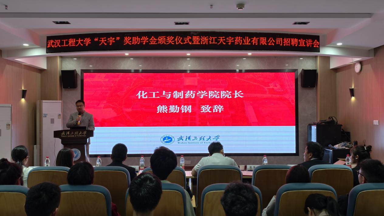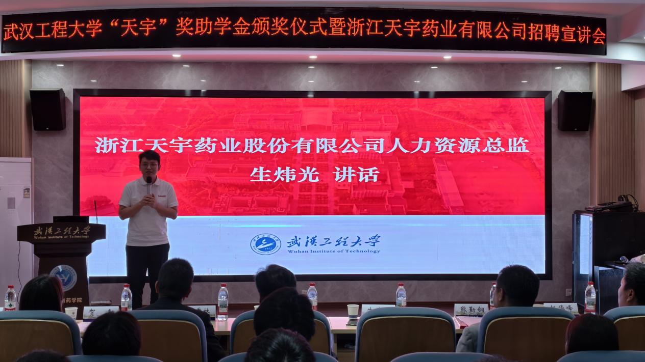 本网讯(通讯员 张锦 张宇轩)10 月 16 日下午 ,武汉工程大学 “天宇” 奖助学金颁奖仪式暨浙江天宇药业股份有限公司招聘宣讲会在流芳校区隆重举行。浙江天宇药业股份有限公司人力资源高级总监生炜光、质量控制总工汪秀林、生产经理赵华峰,化工与制药学院党委书记杨海波、院长熊勤钢及师生代表共同出席仪式,仪式由化工与制药学院党委副书记周丹主持。