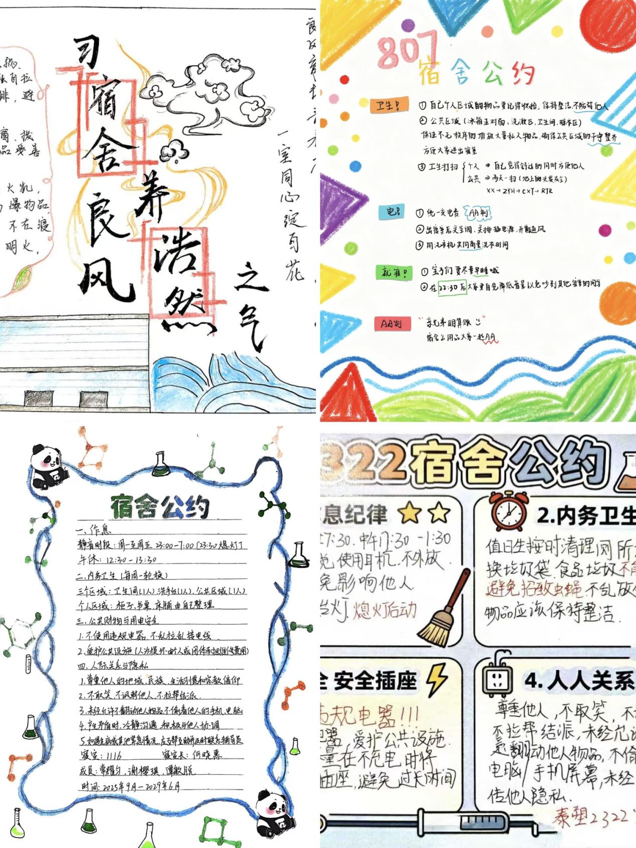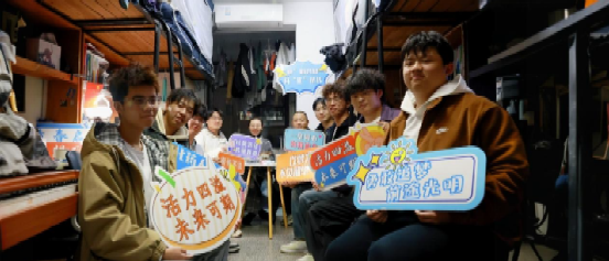 二是涵养宿舍阵地,以美聚力,筑牢集体成长根基。学院将美育落地到宿舍文化建设,推动美育融入日常点滴。学院以宿舍文化建设为抓手,开展了“美育润寝,公约暖心”最美宿舍公约手绘设计大赛、“美韵塑寝,乐聚同行”寝室文化节,将集体共识、文明规范、相处准则转化为兼具思想性与艺术性的手绘作品,打造专属宿舍“文化名片”,既美化了宿舍物理环境,更凝聚了团结友爱、互帮互助的集体氛围。学院还开展通过开展“‘寝’心答疑,共‘化’成长”师生茶话会,辅导员、教师、学院学生组织负责人等深入宿舍与学生面对面交流,解答学业困惑、分享成长经验、疏导心理压力,让宿舍成为充满温情与正能量的“成长共同体”,推动集体意识在美育浸润中深深扎根。