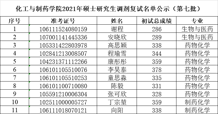 武汉工程大学化工与制药学院2021年硕士研究生调剂复试名单公示(第七批)