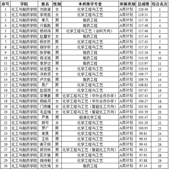根据《武汉工程大学关于推荐优秀应届本科毕业生免试攻读硕士学位研究生管理办法(修订)》的通知(武工大研发〔2021〕11号)和《武汉工程大学化工与制药学院2024年推荐优秀应届本科毕业生免试攻读硕士学位研究生工作方案》的文件精神,经学生本人申请,学院推免生遴选工作小组资格审查、专家综合考核和评议,按照学校下达名额的1:1.2提出候选人的原则,确定获得2024年推荐免试攻读硕士学位研究生资格初选名单,按总成绩(总成绩=所修课学分加权平均成绩+奖励得分+学院综合考核得分)进行排序公示如下: