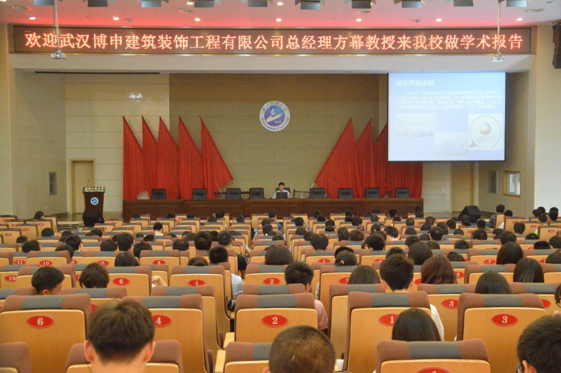 5月6日上午,武汉博申建筑装饰工程有限公司总经理方幕在流芳校区四教多功能报告厅作了题为“绿色环保涂料——创新与创业漫谈”的学术报告。化工与制药学院、国际学院300余名学生聆听了报告,报告会由“有关人才计划”特聘教授、科技处处长郭嘉主持。