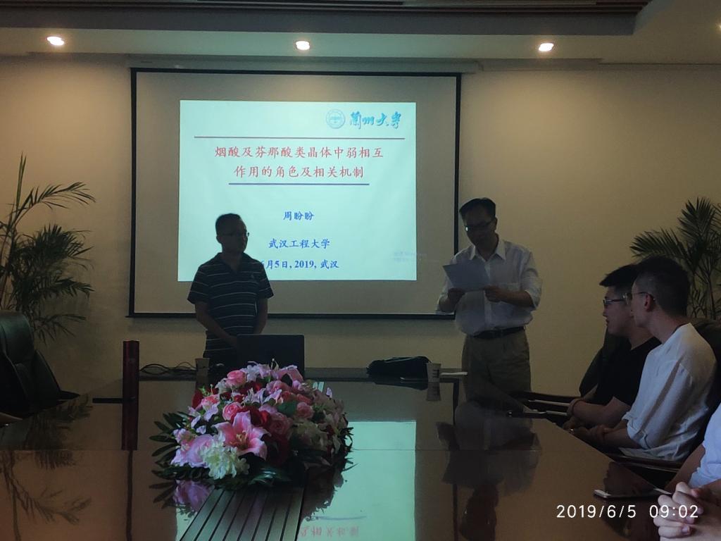 6月5日上午,应研究生院,化工与制药学院,绿色化工过程教育部重点实验室,湖北省新型反应器与绿色化学工艺重点实验室邀请,兰州大学化学化工学院副教授周盼盼博士在流芳校区化工大楼605会议室作了一场题为“烟酸及芬那酸类晶体中弱相互作用的角色及相关机制”的学术报告。报告会由化工与制药学院副院长龙思会教授主持,化工与制药学院师生100余人聆听了报告。