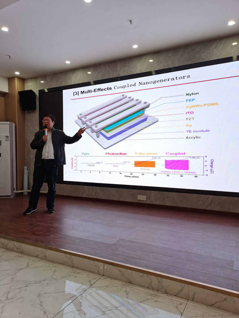 报告开始,杨亚研究员为我们介绍了基于新型微纳米材料摩擦起电的微型发电机的研究背景。主要包括新型发电机的应用前景,工作原理以及他们研究团队在新型微纳米发电机领域取得的国际性的创新性研究成果。指出了新型复合与耦合纳米发电机与传统风力发电机相比具有更低的建设成本,更高的风能利用率和更好的安全性能等优点。同时这类新型发电机可以帮助许多电子设备对于传统蓄电池的依赖,延长电子设备的使用时间,在提升电子设备使用的便捷性以及缓解能源压力,减少环境污染等方面具有重要意义。