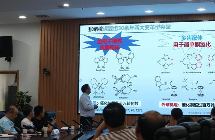 张绪穆教授作了题为“绿色催化-决胜制药”的学术报告。他从绿色合成的关键技术——催化不对称氢化出发,分享了其团队30余年在双膦配体和多齿配体等领域的开创性研究和产业化应用。详细介绍了其团队发现的新催化剂、新反应、新方法和开发的药物合成新工艺,充分诠释了手性药物合成中绿色催化在降低生产成本、减少环境污染、提高产品质量和保障安全可控等方面的巨大优势。该团队开发的多项颠覆性制药新工艺,具有重大的经济价值、环保价值和社会意义,体现了绿色催化的极大魅力。化工与制药学院院长易群主持报告会。