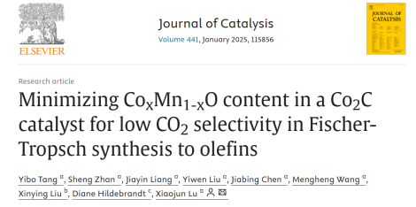 本网讯(通讯员 唐伊博)近日,武汉工程大学化工与制药学院陆小军教授课题组在费托合成制烯烃领域取得进展。该研究的部分成果近日以“Minimizing CoxMn1-xO content in a Co2C catalyst for low CO2 selectivity in Fischer-Tropsch synthesis to olefins”为题在催化领域权威期刊《Journal of Catalysis》上发表。武汉工程大学为该论文的第一单位和通讯单位,博士生唐伊博为第一作者,陆小军教授为通讯作者。